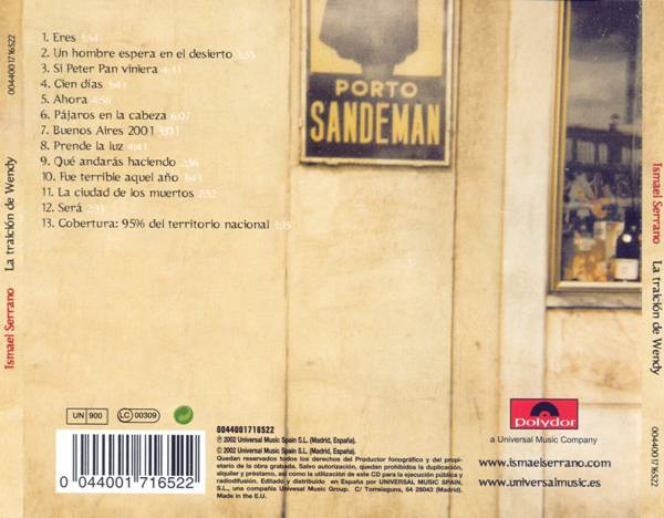 Artista(s) / Grupo: Ismael Serrano ‎ | Cantidad de Discos: 1 | Lanzamiento: 2002 | Género(s): Rock. | Estilo(s): Acoustic, Soft Rock. | Título: La Traición De Wendy | Artista(s) / Grupo: Ismael Serrano ‎ | Cantidad de Discos: 1 | Lanzamiento: 2002 | Género(s): Rock. | Estilo(s): Acoustic, Soft Rock. | Título: La Traición De Wendy