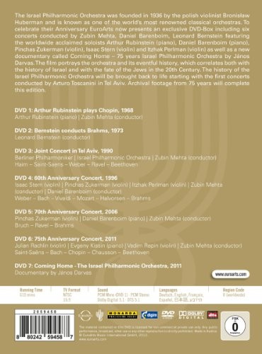 Este lujoso set de caja de aniversario de 7 DVD es una necesidad para todos los fanáticos y amigos de la Orquesta Filarmónica de Israel. Abundan los conciertos históricos repletos de estrellas, desde Arthur Rubinstein tocando a Chopin y Bernstein dirigiendo a Brahms hasta Pinchas Zukerman, Itzhak Perlman, Daniel Barenboim, Gil Shaham, Evgeny Kissin, Isaac Stern y otros parando para honrar a la Orquesta en los principales conciertos de aniversario. Nueve horas gloriosas de música concluyen con Coming Home, J + nos dice el oportuno y sensible retrato documental de la Filarmónica de Israel de Darvas. ¡No ser extrañado!