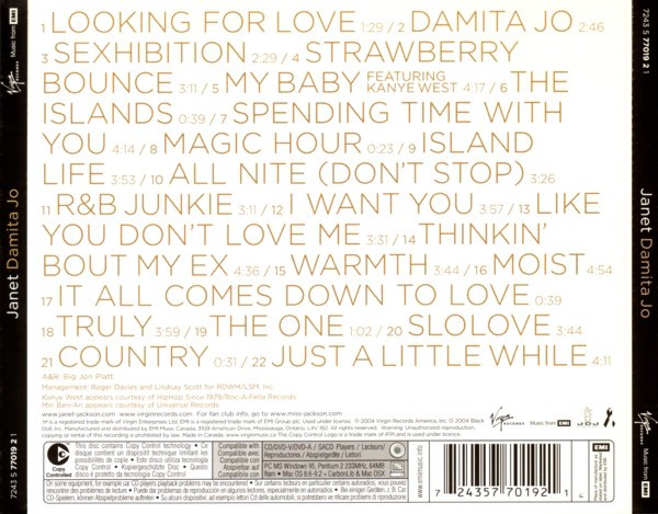 Artista(s) / Grupo: Janet Jackson | Cantidad de Discos: 1 | Lanzamiento: 2004 | Género(s): Hip Hop, Pop | Estilo(s): RnB/Swing | Título: Damita Jo | Artista(s) / Grupo: Janet Jackson | Cantidad de Discos: 1 | Lanzamiento: 2004 | Género(s): Hip Hop, Pop | Estilo(s): RnB/Swing | Título: Damita Jo