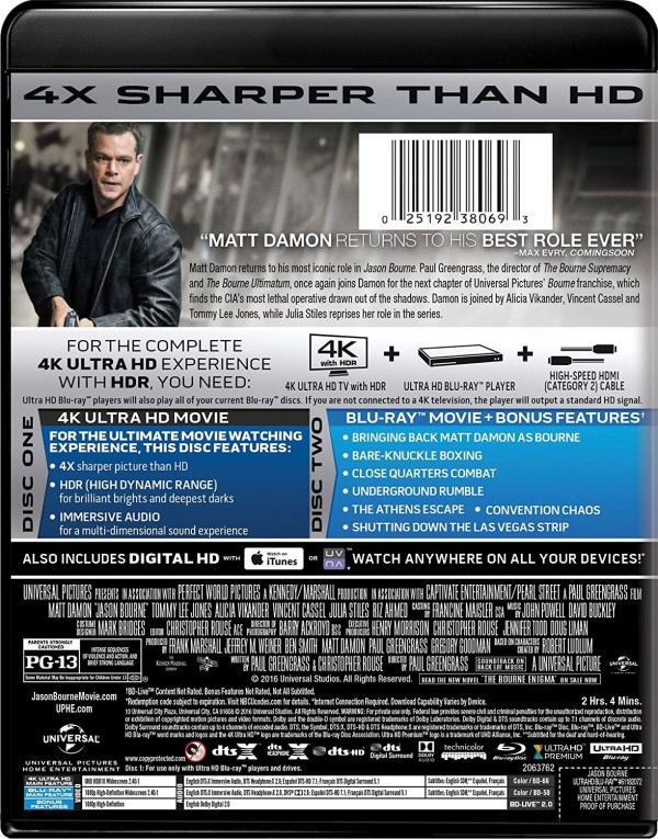 Lanzamiento: 2016 | Género(s): Thriller | Audio: Inglés (DTS-HD MA 5.1), Francés (DTS-HD MA 5.1), Español (DTS-HD MA 5.1) | SubtÃtulos: Inglés, Español, Francés | TÃtulo: Jason Bourne (4K Ultra HD + Blu-ray + UltraViolet) | Director(es): Paul Greengrass | Reparto: Matt Damon, Alicia Vikander, Julia Stiles, Tommy Lee Jones, Vincent Cassel, Ato Essandoh, Riz Ahmed, Scott Shepherd, Bill Camp, Vinzenz Kiefer, Stephen Kunken, Ben Stylianou, Kaya Yuzuki, Matthew O’Neill, Lizzie Phillips, Paris Stangl | Sub-CategorÃas: Acción | Norma / Región: NTSC (Región A) | Lanzamiento: 2016 | Género(s): Thriller | Audio: Inglés (DTS-HD MA 5.1), Francés (DTS-HD MA 5.1), Español (DTS-HD MA 5.1) | SubtÃtulos: Inglés, Español, Francés | TÃtulo: Jason Bourne (4K Ultra HD + Blu-ray + UltraViolet) | Director(es): Paul Greengrass | Reparto: Matt Damon, Alicia Vikander, Julia Stiles, Tommy Lee Jones, Vincent Cassel, Ato Essandoh, Riz Ahmed, Scott Shepherd, Bill Camp, Vinzenz Kiefer, Stephen Kunk
