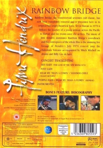 Artista(s) / Grupo: Jimi Hendrix | Cantidad de Discos: 1 | Lanzamiento: 2009 | Género(s): Rock | Estilo(s): Blues Rock, Psychedelic Rock | Audio: Inglés (Dolby Digital) | Título: Rainbow Bridge | Norma / Región: PAL Multizona | Artista(s) / Grupo: Jimi Hendrix | Cantidad de Discos: 1 | Lanzamiento: 2009 | Género(s): Rock | Estilo(s): Blues Rock, Psychedelic Rock | Audio: Inglés (Dolby Digital) | Título: Rainbow Bridge | Norma / Región: PAL Multizona