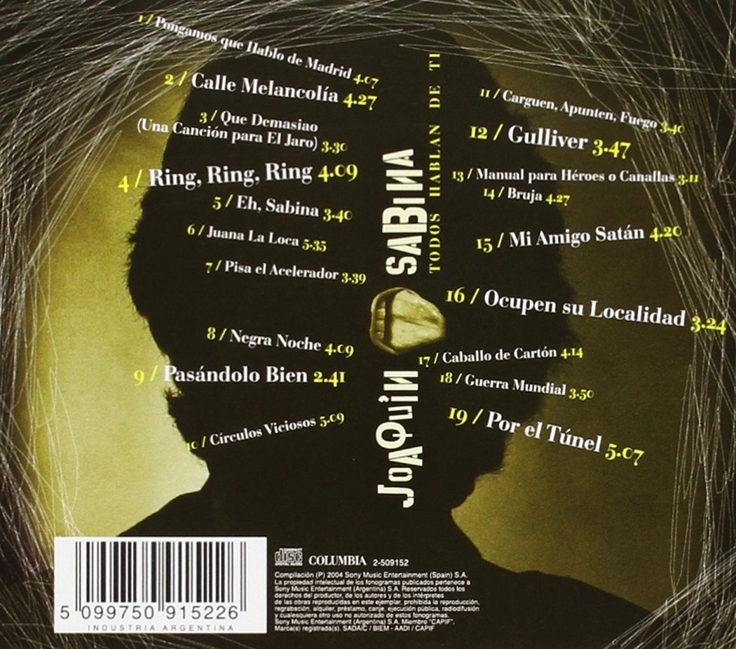 Artista(s) / Grupo: JoaquÃn Sabina | Cantidad de Discos: 1 | Lanzamiento: 2004 | Género(s): Latin | TÃtulo: Todos Hablan de Ti | Artista(s) / Grupo: JoaquÃn Sabina | Cantidad de Discos: 1 | Lanzamiento: 2004 | Género(s): Latin | TÃtulo: Todos Hablan de Ti