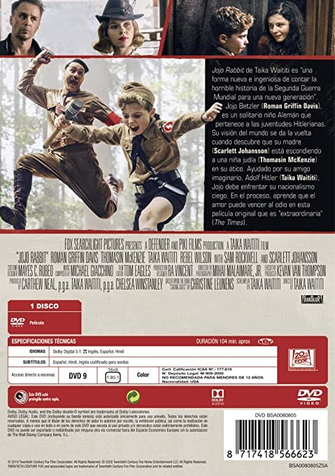 Cantidad de Discos: 1 | Lanzamiento: 2019 | Género(s): Comedia. Drama | Audio: Español (Dolby Digital 5,1), Inglés (Dolby Digital 5,1) | SubtÃtulos: Español, Inglés, Francés | TÃtulo: Jojo Rabbit | Director(es): Taika Waititi. | Reparto: Roman Griffin Davis, Scarlett Johansson, Thomasin McKenzie, Taika Waititi, Sam Rockwell, Rebel Wilson, Alfie Allen, Stephen Merchant, Archie Yates, Luke Brandon Field, Sam Haygarth, Stanislav Callas, Joe Weintraub, Brian Caspe, Gabriel Andrews, Billy Rayner, Christian Howlings, Gilby Griffin Davis, Hardy Griffin Davis, Curtis Matthew, Robert East | Norma / Región: NTSC (Región 1, 4) | Cantidad de Discos: 1 | Lanzamiento: 2019 | Género(s): Comedia. Drama | Audio: Español (Dolby Digital 5,1), Inglés (Dolby Digital 5,1) | SubtÃtulos: Español, Inglés, Francés | TÃtulo: Jojo Rabbit | Director(es): Taika Waititi. | Reparto: Roman Griffin Davis, Scarlett Johansson, Thomasin McKenzie, Taika Waititi, Sam Rockwell, Rebel Wilson, Alfie Allen, Stephen Merchant, Archie Y