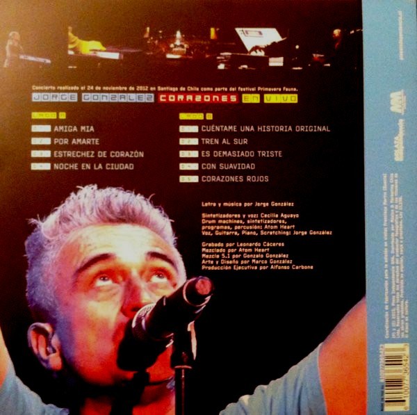 Artista(s) / Grupo: Jorge González | Cantidad de Discos: 1 LP | Lanzamiento: 2013 | Género(s): Electronic, Latin, Pop | Título: Corazones – En Vivo | Artista(s) / Grupo: Jorge González | Cantidad de Discos: 1 LP | Lanzamiento: 2013 | Género(s): Electronic, Latin, Pop | Título: Corazones – En Vivo