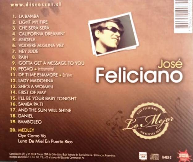 Artista(s) / Grupo: José Feliciano | Cantidad de Discos: 1 | Lanzamiento: 2015 | Estilo(s): Latin | TÃtulo: Lo Mejor | Norma / Región: NTSC (Región 1, 4) | Artista(s) / Grupo: José Feliciano | Cantidad de Discos: 1 | Lanzamiento: 2015 | Estilo(s): Latin | TÃtulo: Lo Mejor | Norma / Región: NTSC (Región 1, 4)