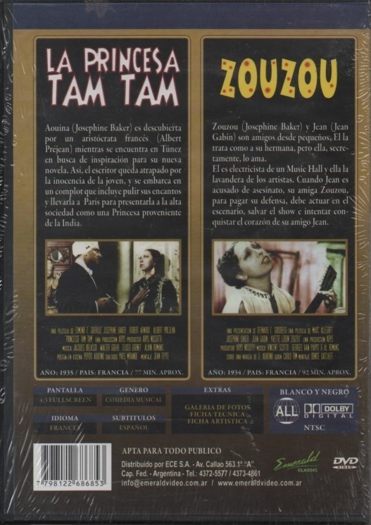 Cantidad de Discos: 1 | Lanzamiento: 2005 | Género(s): Drama | Audio: Francés | SubtÃtulos: Español | TÃtulo: Josephine Baker – La Princesa Tam Tam / Zou Zou | Director(es): Edmond T. Greville / Marc Allegret | Reparto: Josephine Baker, Robert Arnoux, Albert Prejean, Jean Gabin, Yvette Lebon | Sub-CategorÃas: Musical | Norma / Región: Multizona | Cantidad de Discos: 1 | Lanzamiento: 2005 | Género(s): Drama | Audio: Francés | SubtÃtulos: Español | TÃtulo: Josephine Baker – La Princesa Tam Tam / Zou Zou | Director(es): Edmond T. Greville / Marc Allegret | Reparto: Josephine Baker, Robert Arnoux, Albert Prejean, Jean Gabin, Yvette Lebon | Sub-CategorÃas: Musical | Norma / Región: Multizona