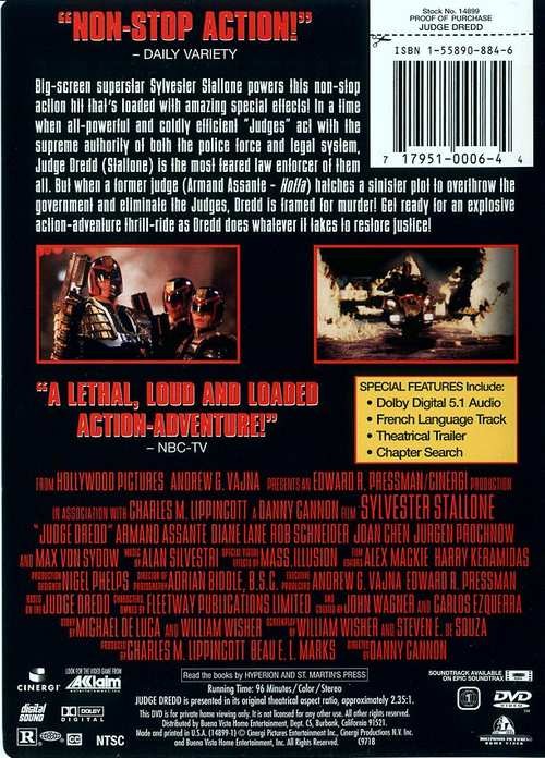 Cantidad de Discos: 1 | Lanzamiento: 1995 | Género(s): Acción | Audio: Inglés (Dolby digital 5.1), francés (Dolby Dgital Mono, Dolby Digital Stereo) | TÃtulo: El Juez Dredd | Director(es): Danny Cannon | Reparto: Sylvester Stallone, Armand Assante, Diane Lane, Rob Schneider, Max von Sydow, Ewen Bremner, Joan Chen, Jürgen Prochnow, Joanna Miles, Balthazar Getty | Norma / Región: NTSC (Región 1, 4) | Cantidad de Discos: 1 | Lanzamiento: 1995 | Género(s): Acción | Audio: Inglés (Dolby digital 5.1), francés (Dolby Dgital Mono, Dolby Digital Stereo) | TÃtulo: El Juez Dredd | Director(es): Danny Cannon | Reparto: Sylvester Stallone, Armand Assante, Diane Lane, Rob Schneider, Max von Sydow, Ewen Bremner, Joan Chen, Jürgen Prochnow, Joanna Miles, Balthazar Getty | Norma / Región: NTSC (Región 1, 4)