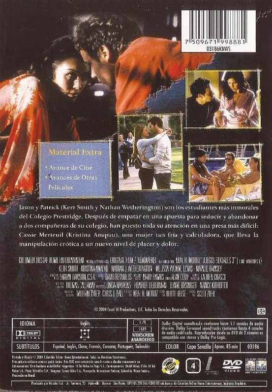 Cantidad de Discos: 1 | Lanzamiento: 2004 | Género(s): Drama | Audio: Inglés | SubtÃtulos: Inglés, Español, Francés, Portugués | TÃtulo: Juegos sexuales 3 | Director(es): Scott Ziehl | Reparto: Kerr Smith, Kristina Anapau, Nathan Wetherington, Melissa Yvonne Lewis, Natalie Ramsey, Tom Parker, Michael Pemberton, Tara Carroll, Charlie Weber, Alex Donnelley, William Gregory Lee, Aaron MacPherson | Sub-CategorÃas: Drama | Norma / Región: NTSC 4 | Cantidad de Discos: 1 | Lanzamiento: 2004 | Género(s): Drama | Audio: Inglés | SubtÃtulos: Inglés, Español, Francés, Portugués | TÃtulo: Juegos sexuales 3 | Director(es): Scott Ziehl | Reparto: Kerr Smith, Kristina Anapau, Nathan Wetherington, Melissa Yvonne Lewis, Natalie Ramsey, Tom Parker, Michael Pemberton, Tara Carroll, Charlie Weber, Alex Donnelley, William Gregory Lee, Aaron MacPherson | Sub-CategorÃas: Drama | Norma / Región: NTSC 4