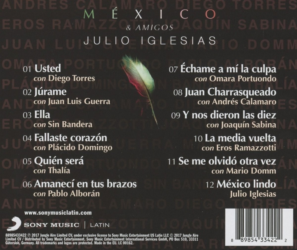 Julio Iglesias, el artista latino más vendedor de la historia vuelve a sorprendernos! Y en esta ocasión lo hace interpretando de nuevo las canciones de su último disco dedicado a México, con la colaboración de grandes artistas como Joaquín Sabina, Pablo Alborán, Plácido Domingo, Juan Luis Guerra, Omara Portuondo o Eros Ramazzotti entre otros. Un plantel de grandes artistas reunidos en “México & Amigos” . Doce canciones con sabor mexicano compartidas ahora a dúo entre Julio & amigos. Repertorio 1.- Usted- ft Diego Torres 2.- Júrame- ft Juan Luis Guerra 3.- Ella- ft Sin Bandera 4.- Fallaste corazón- ft Plácido Domingo 5.- Quién será?- ft Thalía 6.- Amanecí en tus brazos- ft Pablo Alborán 7.- Échame a mí la culpa- ft Omara Portuondo 8.- Juan Charrasqueado – ft Andrés Calamaro 9.- Y nos dieron las diez- ft Joaquín Sabina 10.- La media vuelta – ft Eros Ramazzotti 11.- Se me olvidó otra vez – ft Mario Domm 12.- México lindo