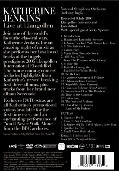 Artista(s) / Grupo: Katherine Jenkins | Cantidad de Discos: 1 | Lanzamiento: 2006 | Género(s): Pop, Classical, Folk, World, & Country, Stage & Screen | TÃtulo: Live at Llangollen | Norma / Región: NTSC (Región 1, 4) | Artista(s) / Grupo: Katherine Jenkins | Cantidad de Discos: 1 | Lanzamiento: 2006 | Género(s): Pop, Classical, Folk, World, & Country, Stage & Screen | TÃtulo: Live at Llangollen | Norma / Región: NTSC (Región 1, 4)