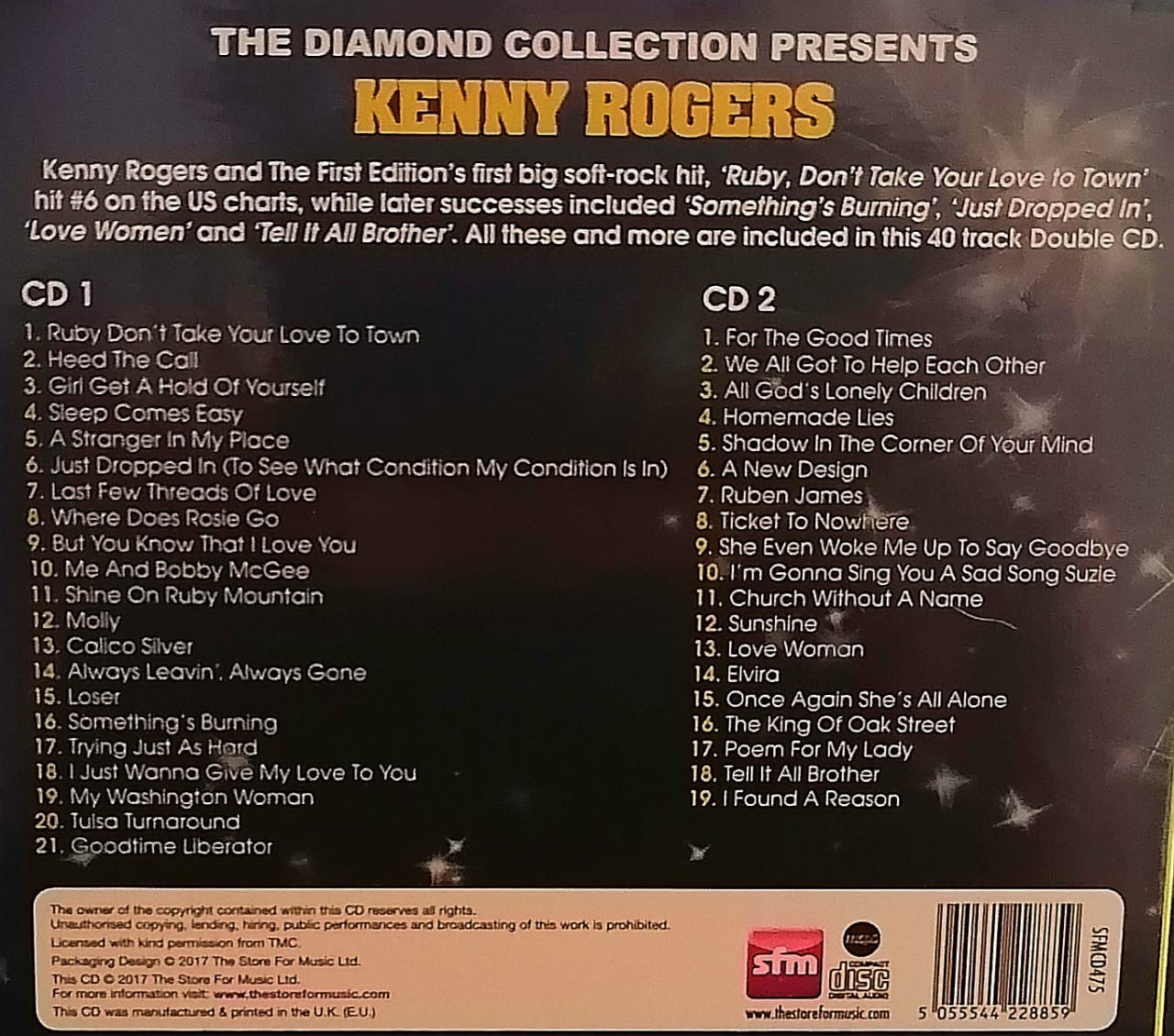 Artista(s) / Grupo: Kenny Rogers | Cantidad de Discos: 2 CD | Lanzamiento: 2017 | Género(s): Folk, World, & Country | TÃtulo: Diamosnds are forever | Artista(s) / Grupo: Kenny Rogers | Cantidad de Discos: 2 CD | Lanzamiento: 2017 | Género(s): Folk, World, & Country | TÃtulo: Diamosnds are forever