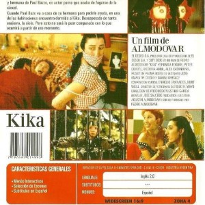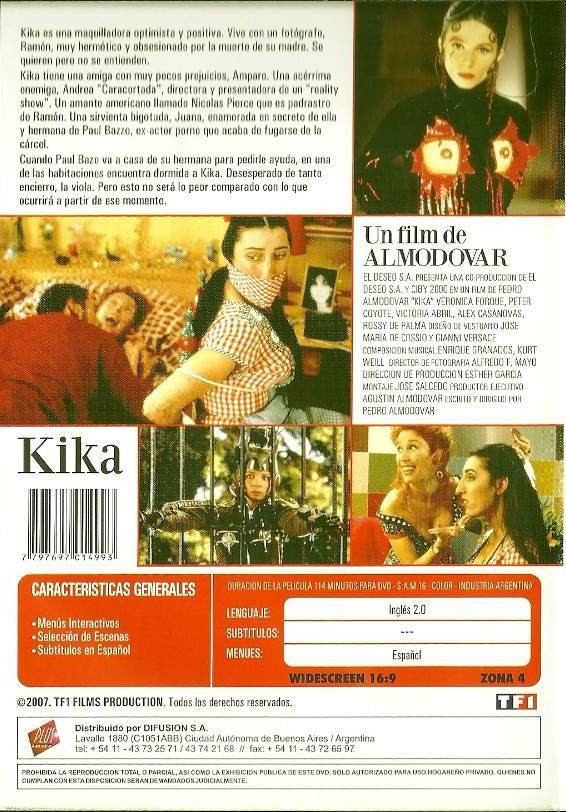 Kika (Veronica Forque) es una maquilladora madrileña que se enamora de Ramon (Alex Casanovas), un hombre muerto cuyo rostro Kika es contratado para prepararse para un funeral. La atracción de Kika resucita a Ramón, y los dos comienzan a convivir. Kika se ve envuelta en un par de planes criminales, uno que involucra a su doncella Juana (Rossy De Palma) y al amoroso y retardado hermano de Juana, Pablo (Santiago Lajusticia), y el otro al padre de Ramon, Nicholas (Peter Coyote). Después de que Kika sea violada por Pablo, ella se entera de que Ramon grabó en video el incidente, y las imágenes terminaron en un tabloide de televisión presentado por Andrea Scarface (Victoria Abril). Kika y Ramon se separan, pero este último descubre a su padre ‘ s complicidad en la desaparición de su madre, lo que lleva a una violenta confrontación. Debido al tratamiento humorístico de Almodóvar de la violación de la película, Kika fue su tercera película consecutiva que resultó en acusaciones críticas de misoginia y explotación.