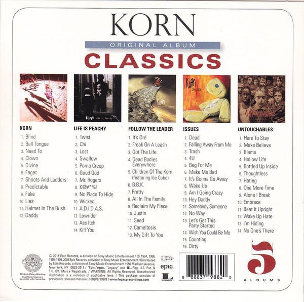 Artista(s) / Grupo: Korn ‎ | Cantidad de Discos: 5 | Lanzamiento: 2013 | Género(s): Rock | Estilo(s): Metalcore | TÃtulo: Original Album Classics | Artista(s) / Grupo: Korn ‎ | Cantidad de Discos: 5 | Lanzamiento: 2013 | Género(s): Rock | Estilo(s): Metalcore | TÃtulo: Original Album Classics