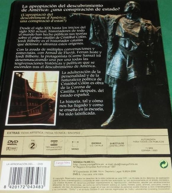 Cantidad de Discos: 1 | Lanzamiento: 2006 | Género(s): Documental | Estilo(s): L’apropiació del descobriment d` Amèrica: una conspiració d’estat? | Audio: Catalán | Subtítulos: Español | Director(es): David Grau | Reparto: Carmen Sansa, Anna Abadia, Cesar Puente, Miguel Esquirol | Norma / Región: PAL (Región 2) | Cantidad de Discos: 1 | Lanzamiento: 2006 | Género(s): Documental | Estilo(s): L’apropiació del descobriment d` Amèrica: una conspiració d’estat? | Audio: Catalán | Subtítulos: Español | Director(es): David Grau | Reparto: Carmen Sansa, Anna Abadia, Cesar Puente, Miguel Esquirol | Norma / Región: PAL (Región 2)