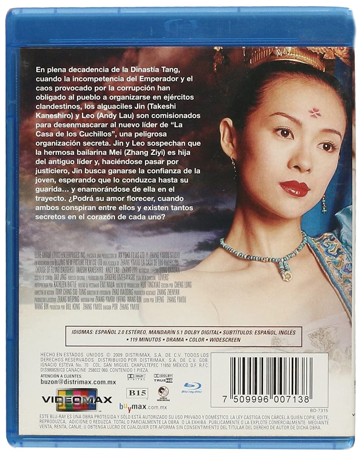 Cantidad de Discos: 1 | Lanzamiento: 2004 | Género(s): Acción, Aventura, Drama | Audio: Inglés | SubtÃtulos: Español | TÃtulo: Shi mian mai fu (House of Flying Daggers) | Director(es): Zhang Yimou | Reparto: Zhang Ziyi, Takeshi Kaneshiro, Andy Lau, Song Dandan, Hao Baijie, Liu Ying, Li Qiang, Wang Kun, Chen Liang, Yang Wen, Hongfei Zhao, Jun Guo, Shu Zhang, Jiusheng Wang, Zhengyong Zhang, Yongxin Wang, Qi Zi, Xuedong Qu, Liping Tian, Hongwei Zhao, Weina Huang, Dan Ge, Xiadong Yang, Yisha Shang, Jingwen Huang, | Norma / Región: NTSC (Región 1, 4) | Cantidad de Discos: 1 | Lanzamiento: 2004 | Género(s): Acción, Aventura, Drama | Audio: Inglés | SubtÃtulos: Español | TÃtulo: Shi mian mai fu (House of Flying Daggers) | Director(es): Zhang Yimou | Reparto: Zhang Ziyi, Takeshi Kaneshiro, Andy Lau, Song Dandan, Hao Baijie, Liu Ying, Li Qiang, Wang Kun, Chen Liang, Yang Wen, Hongfei Zhao, Jun Guo, Shu Zhang, Jiusheng Wang, Zhengyong Zhang, Yongxin Wang, Qi Zi, Xuedong Qu, Liping Tian, Hongwei Zhao, Wein