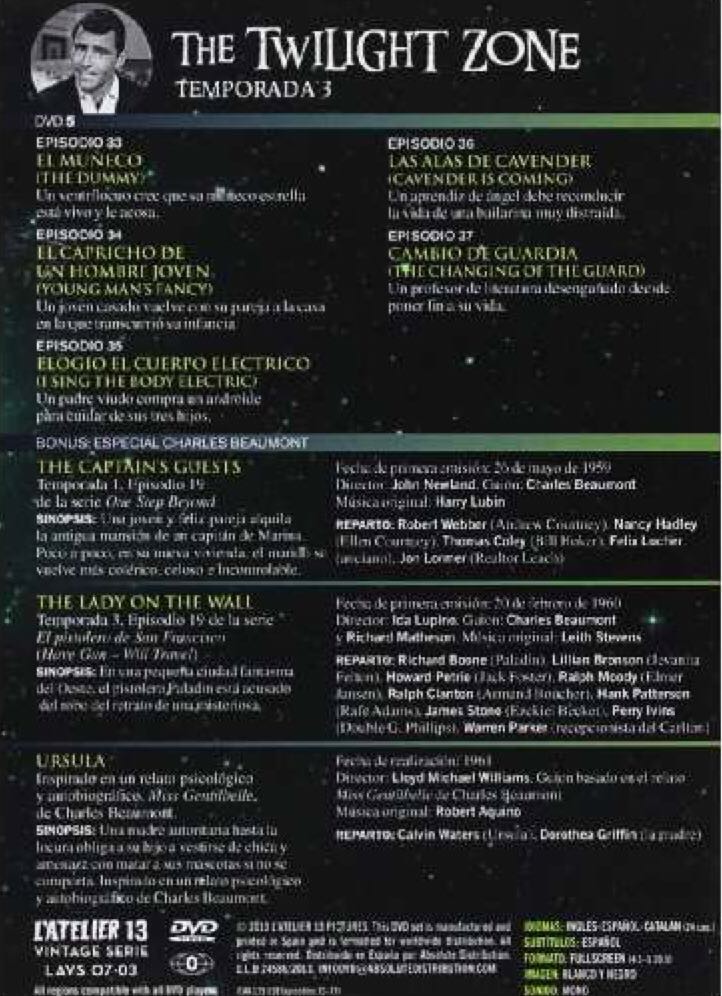Cantidad de Discos: 4 | Lanzamiento: 2010 | Género(s): Serie de TV, Fantástico, Terror, Ciencia ficción, Intriga, Thriller | Audio: Inglés, Español | SubtÃtulos: Español | TÃtulo: Dimensión Desconocida (60′) – Temporada 1 | Director(es): Rod Serling (Creator), John Brahm, Douglas Heyes, Buzz Kulik, Lamont Johnson, Richard L, Bare, James Sheldon, Richard Donner, Don Medford, Montgomery Pittman, Jack Smight, Alvin Ganzer, Ted Post, William F, Claxton, Elliot Silverstein, Abner B | Reparto: Rod Serling, Burgess Meredith, Vaughn Taylor, Jack Klugman, J, Pat O’Malley, William Shatner, Lee Marvin, Cliff Robertson, Anne Francis, Martin Landau, Dick York, Martin Balsam, Jack Warden, Warren Oates, Donald Pleasence, Charles Bronson, Peter Falk, Vera Miles, Buster Keaton, Robert Redford, Dennis Hopper, Robert Duvall, Dean Stockwell, Roddy McDowll, Kevin McCarthy, Dan Duryea, Agnes Moorehead, Elizabeth Montgomery, Mickey Rooney, Telly Savalas, James Whitmore, Murray Hamilton