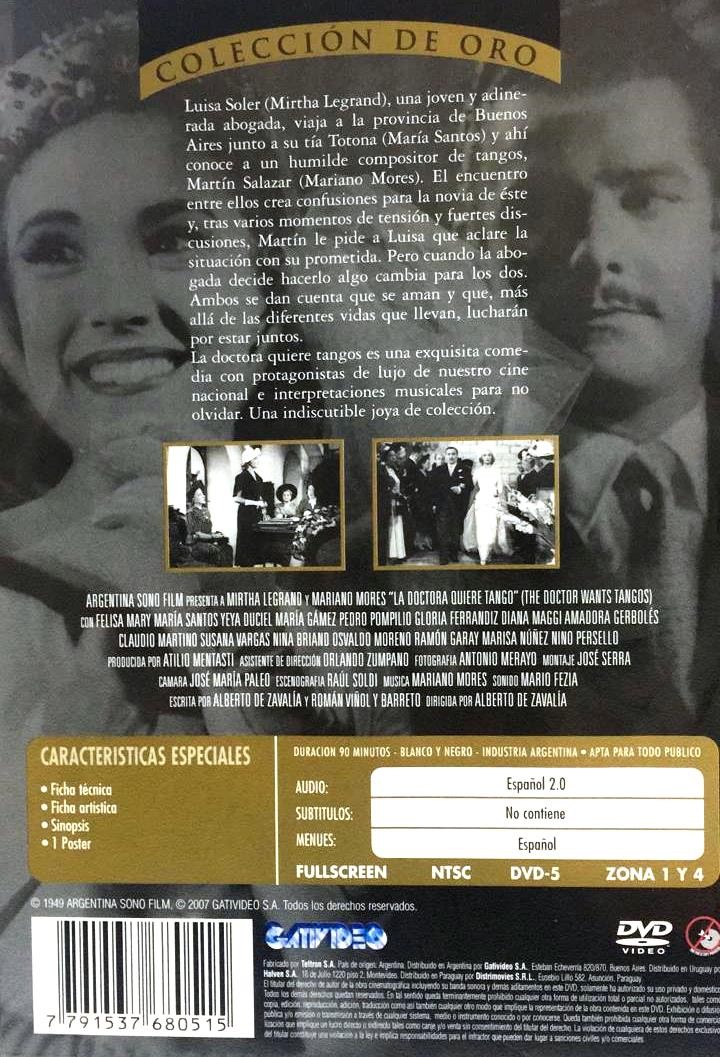 Cantidad de Discos: 1 | Lanzamiento: 1949 | Género(s): Comedia | Estilo(s): Comedia Musical | Título: La Doctora Quiere Tangos | Director(es): Alberto De Zavalia | Reparto: Mirtha Legrand, Mariano Mores, Felisa Mary, María Santos, María Gámez, Diana Maggi, Yeya Duciel, Claudio Martino, Gloria Ferrandiz | Norma / Región: NTSC (Región 1, 4) | Cantidad de Discos: 1 | Lanzamiento: 1949 | Género(s): Comedia | Estilo(s): Comedia Musical | Título: La Doctora Quiere Tangos | Director(es): Alberto De Zavalia | Reparto: Mirtha Legrand, Mariano Mores, Felisa Mary, María Santos, María Gámez, Diana Maggi, Yeya Duciel, Claudio Martino, Gloria Ferrandiz | Norma / Región: NTSC (Región 1, 4)