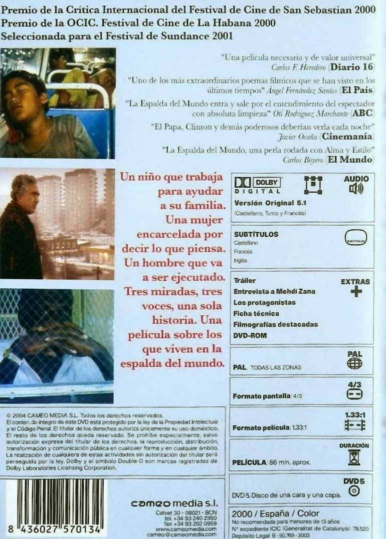 Cantidad de Discos: 1 | Lanzamiento: 2000 | Género(s): Documental | Audio: Español, Turco, Francés | SubtÃtulos: Español, Francés, Inglés | TÃtulo: La Espalda Del Mundo | Director(es): Javier Corcuera | Reparto: Documental, Guinder RodrÃguez, Mehdi Zana, Thomas Miller-El | Norma / Región: Multizona | Cantidad de Discos: 1 | Lanzamiento: 2000 | Género(s): Documental | Audio: Español, Turco, Francés | SubtÃtulos: Español, Francés, Inglés | TÃtulo: La Espalda Del Mundo | Director(es): Javier Corcuera | Reparto: Documental, Guinder RodrÃguez, Mehdi Zana, Thomas Miller-El | Norma / Región: Multizona