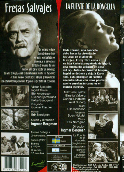 Victor Sjöström, Bibi Andersson, Ingrid Thulin, Gunnar Björnstrand, Folke Sundquist, Björn Bjelvenstam, Naima Wifstrand, Jullan Kindahl, Max von Sydow, Ake Fridell | Norma / Región: Multizona | Cantidad de Discos: 1 | Género(s): Drama | Audio: Sueco | SubtÃtulos: Español | TÃtulo: Jungfrukällan o The Virgin Spring (1960) / Smultronstället (1957) | Director(es): Ingmar Bergman | Reparto: Max von Sydow, Birgitta Valberg, Gunnel Lindblom, Birgitta Pettersson, Axel Düberg, Allan Edwall, Tor Isedal/