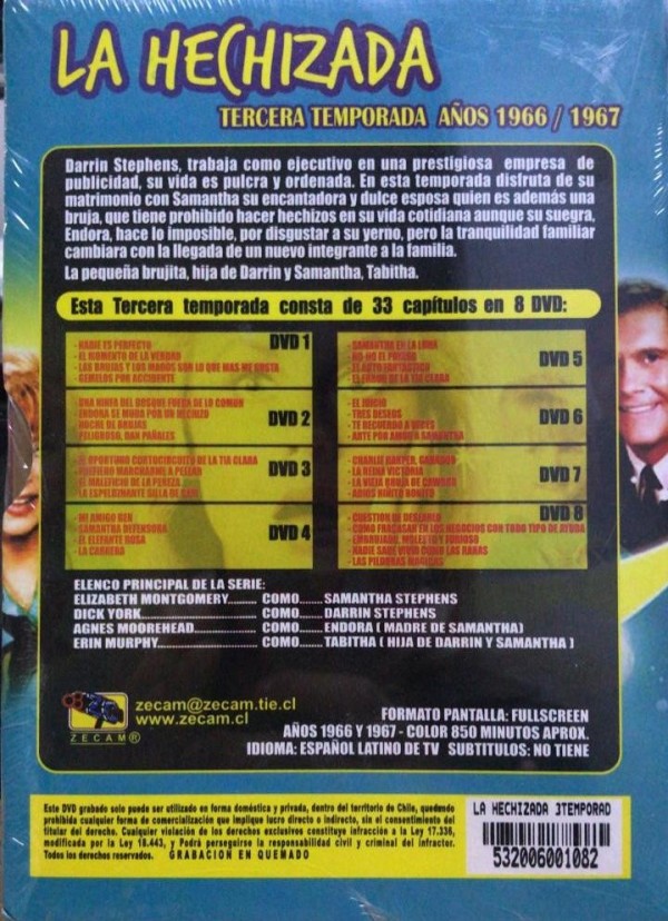 Reparto: Elizabeth Montgomery, Dick York, Agnes Moorehead, Dick Sargent, David White, Erin Murphy, George Tobias, Laura Elliott, Marion Lorne, Sandra Gould, Alice Pearce, Diane Murphy, Bernard Fox, Mabel Albertson, Dick Wilson, Irene Vernon, Maurice Evans, Cosmo Sardo, Paul Lynde