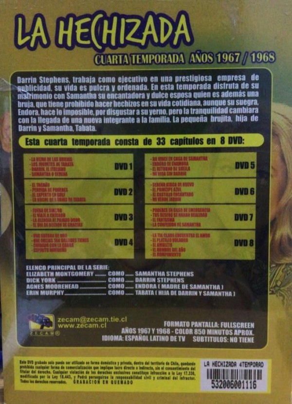 Serie de TV (1964-1972). 8 temporadas. 254 episodios. Samantha Stephens es aparentemente una tÃpica ama de casa norteamericana, felizmente casada con un hombre normal y corriente. Pero Samantha además es una bruja que ha heredado ciertos poderes desde generaciones atrás. A pesar de que intentan ser una pareja normal, ella usará sus poderes mágicos para resolver los diversos problemas a los que se enfrenta su familia.