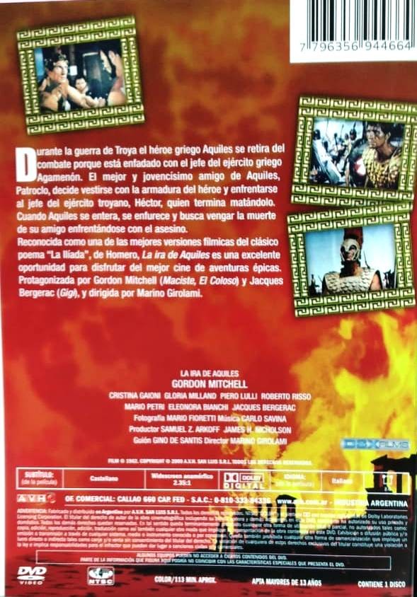 | Norma / Región: NTSC (Región 1, 4) | Cantidad de Discos: 1 | Lanzamiento: 2005 | Género(s): Acción, Aventura, Drama | Audio: Español | SubtÃtulos: Español | TÃtulo: L’ira di Achille (1962) | Director(es): Marino Girolami | Reparto: Gordon Mitchell, Jacques Bergerac, Cristina Gaioni, Gloria Milland, Piero Lulli, Roberto Risso, Mario Petri, Eleonora Bianchi