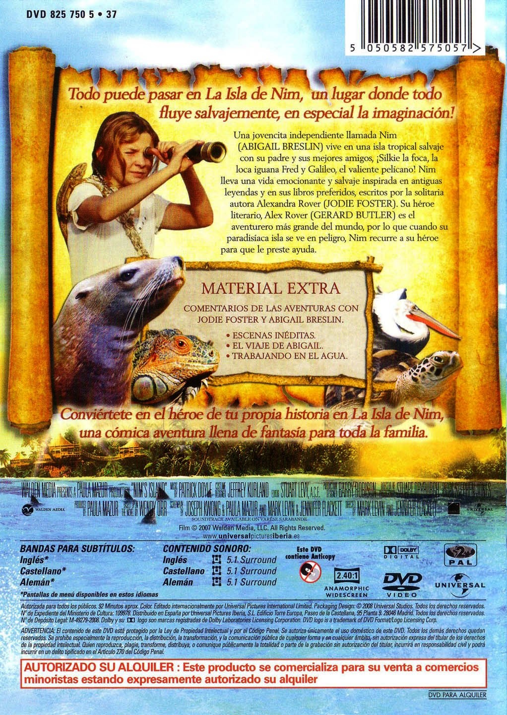 Cantidad de Discos: 1 | Lanzamiento: 2008 | Género(s): Aventuras, Fantástico, Acción | Audio: Inglés, Portugués, Español | SubtÃtulos: Español, Inglés, Portugués | TÃtulo: Nim’s Island | Director(es): Jennifer Flackett, Mark Levin | Reparto: Abigail Breslin, Jodie Foster, Gerard Butler, Michael Carman, Mark Brady, Anthony Simcoe, Christopher Baker, Maddison Joyce, Peter Callan, Bryan Probets, Jay Laga’aia, Marea Lambert Barker, Jon-Claire Lee, Craig Marriott, Cheryl Craig | Norma / Región: NTSC 4 | Cantidad de Discos: 1 | Lanzamiento: 2008 | Género(s): Aventuras, Fantástico, Acción | Audio: Inglés, Portugués, Español | SubtÃtulos: Español, Inglés, Portugués | TÃtulo: Nim’s Island | Director(es): Jennifer Flackett, Mark Levin | Reparto: Abigail Breslin, Jodie Foster, Gerard Butler, Michael Carman, Mark Brady, Anthony Simcoe, Christopher Baker, Maddison Joyce, Peter Callan, Bryan Probets, Jay Laga’aia, Marea Lambert Barker, Jon-Claire Lee, Craig Marriott, Cheryl