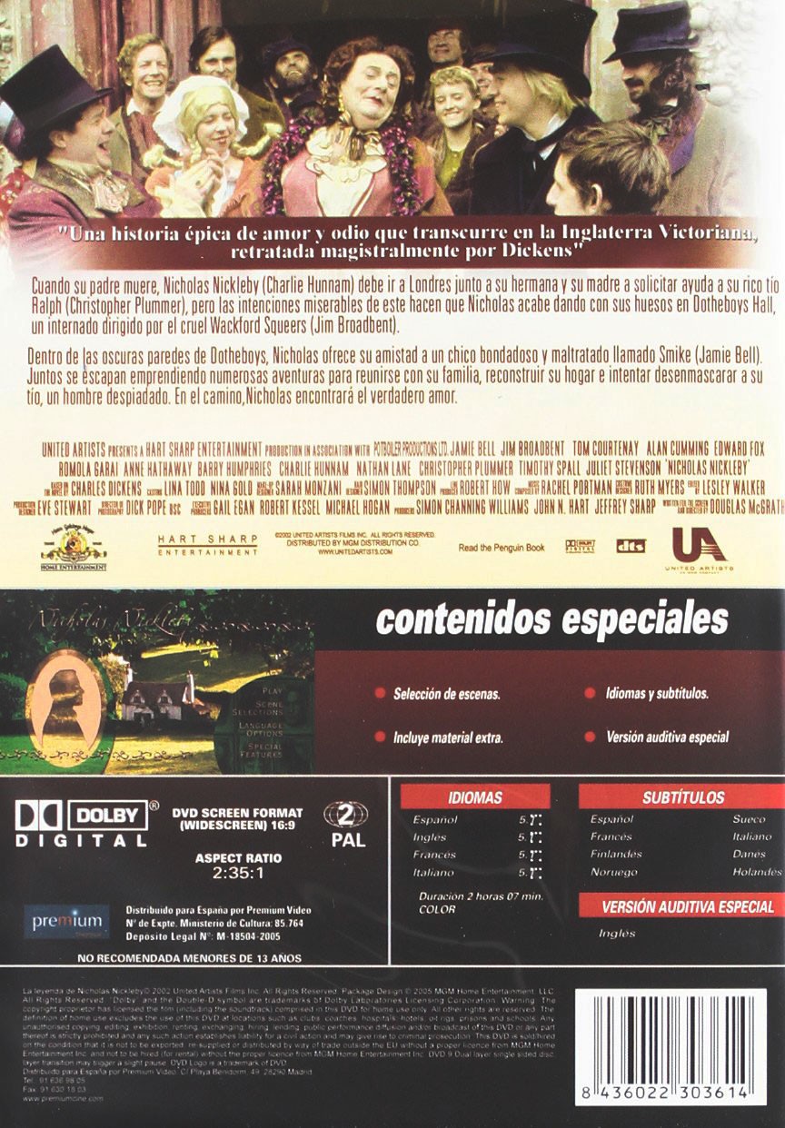 Cantidad de Discos: 1 | Lanzamiento: 2002 | Género(s): Drama. Romance. | Audio: Español, Inglés, Francés | SubtÃtulos: Español, Inglés, Francés | TÃtulo: Nicholas Nickleby | Director(es): Douglas McGrath. | Reparto: Charlie Hunnam, Jamie Bell, Nathan Lane, Christopher Plummer, Jim Broadbent, Tom Courtenay, Anne Hathaway, Alan Cumming, Edward Fox, Timothy Spall, Romola Garai, Juliet Stevenson, Hugh Mitchell. | Norma / Región: PAL (Región 2) | Cantidad de Discos: 1 | Lanzamiento: 2002 | Género(s): Drama. Romance. | Audio: Español, Inglés, Francés | SubtÃtulos: Español, Inglés, Francés | TÃtulo: Nicholas Nickleby | Director(es): Douglas McGrath. | Reparto: Charlie Hunnam, Jamie Bell, Nathan Lane, Christopher Plummer, Jim Broadbent, Tom Courtenay, Anne Hathaway, Alan Cumming, Edward Fox, Timothy Spall, Romola Garai, Juliet Stevenson, Hugh Mitchell. | Norma / Región: PAL (Región 2)