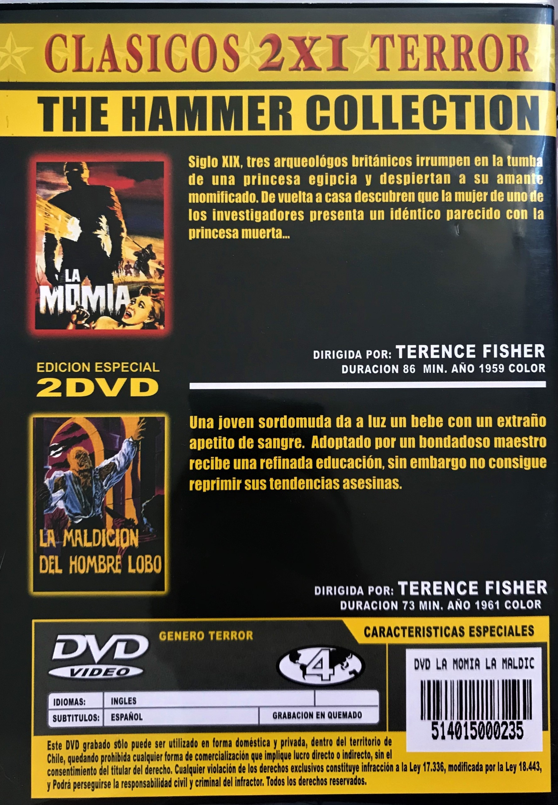 Cantidad de Discos: 2 | Lanzamiento: 2010 | Género(s): Terror | Audio: Inglés | SubtÃtulos: Español | TÃtulo: La momia (1959) / La maldicion del hombre lobo (1961) | Director(es): Terence Fisher | Reparto: Peter Cushing, Christopher Lee, Yvonne Furneaux, Eddie Byrne, Felix Aylmer, Raymond Huntley, George Pastell, Michael Ripper / Oliver Reed, Yvonne Romain, Catherine Feller, Clifford Evans, Anthony Dawson, Richard Wordsworth, Warren Mitchell | Norma / Región: Multizona | Cantidad de Discos: 2 | Lanzamiento: 2010 | Género(s): Terror | Audio: Inglés | SubtÃtulos: Español | TÃtulo: La momia (1959) / La maldicion del hombre lobo (1961) | Director(es): Terence Fisher | Reparto: Peter Cushing, Christopher Lee, Yvonne Furneaux, Eddie Byrne, Felix Aylmer, Raymond Huntley, George Pastell, Michael Ripper / Oliver Reed, Yvonne Romain, Catherine Feller, Clifford Evans, Anthony Dawson, Richard Wordsworth, Warren Mitchell | Norma / Región: Multizona