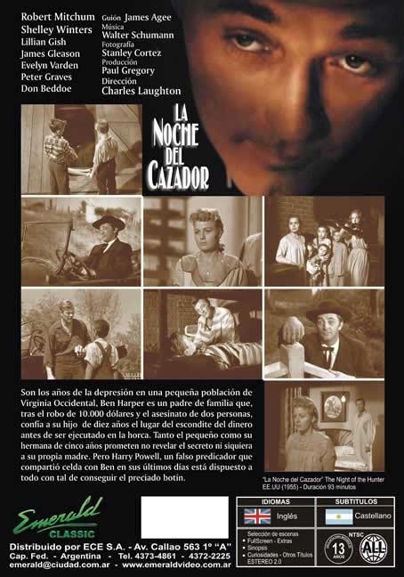 Cantidad de Discos: 1 | Lanzamiento: 2009 | Género(s): Drama, Suspenso | Audio: Inglés | SubtÃtulos: Español | TÃtulo: The Night of the Hunter (1955) | Director(es): Charles Laughton | Reparto: Robert Mitchum, Billy Chapin, Sally Ann Bruce, Shelley Winters, Lillian Gish, Peter Graves, Evely Varden, James Gleason | Norma / Región: Multizona | Cantidad de Discos: 1 | Lanzamiento: 2009 | Género(s): Drama, Suspenso | Audio: Inglés | SubtÃtulos: Español | TÃtulo: The Night of the Hunter (1955) | Director(es): Charles Laughton | Reparto: Robert Mitchum, Billy Chapin, Sally Ann Bruce, Shelley Winters, Lillian Gish, Peter Graves, Evely Varden, James Gleason | Norma / Región: Multizona