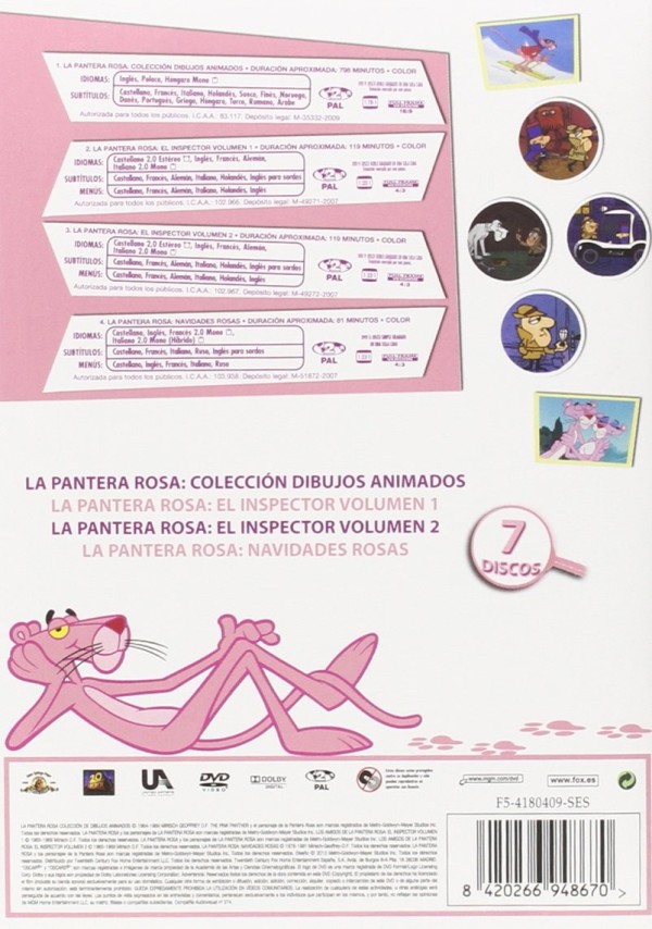 Este pack de 7 DVD´s contiene ‘La Pantera Rosa: Colección de dibijos animados’, ‘Loa amigos de la Pantera Rosa: El inspector (Volúmenes 1 y 2)’ y ‘La Pantera Rosa: Navidades rosas’.