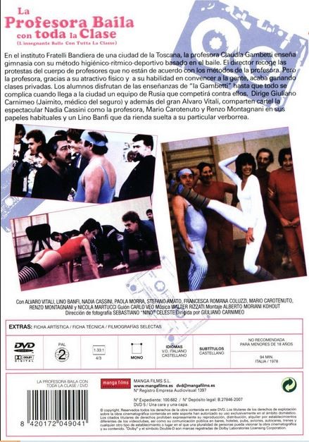 | Norma / Región: PAL (Región 2) | Cantidad de Discos: 1 | Lanzamiento: 1979 | Género(s): Comedia | Audio: Español | TÃtulo: L’insegnante Balla… Con Tutta La Classe | Director(es): Giuliano Carnimeo | Reparto: Nadia Cassini, Lino Banfi, Alvaro Vitali, Paola Morra, Stefano Amato, Maurizio Interlandi, Francesca Romana Coluzzi, Mario Carotenuto, Renzo Montagnani