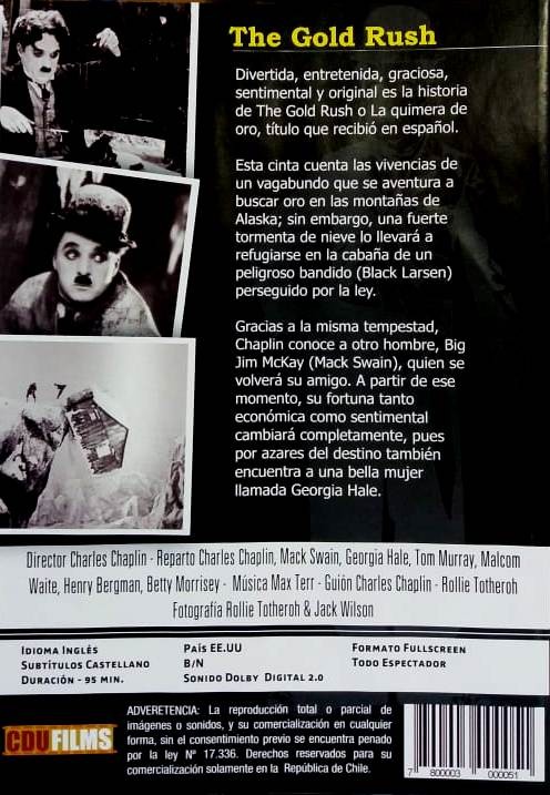 Cantidad de Discos: 1 | Lanzamiento: 2010 | Género(s): Comedia | Audio: Inglés (Dolby Digital 2,0 Stereo) | SubtÃtulos: Español | TÃtulo: The Gold Rush (1925) | Director(es): Charles Chaplin | Reparto: Charles Chaplin, Mack Swain, Georgia Hale, Tom Murray, Malcom Waite, Henry Bergman, Betty Morrisey | Norma / Región: NTSC (Región 1, 4) | Cantidad de Discos: 1 | Lanzamiento: 2010 | Género(s): Comedia | Audio: Inglés (Dolby Digital 2,0 Stereo) | SubtÃtulos: Español | TÃtulo: The Gold Rush (1925) | Director(es): Charles Chaplin | Reparto: Charles Chaplin, Mack Swain, Georgia Hale, Tom Murray, Malcom Waite, Henry Bergman, Betty Morrisey | Norma / Región: NTSC (Región 1, 4)