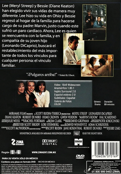 | Norma / Región: NTSC 1, 4 | Cantidad de Discos: 1 | Lanzamiento: 1996 | Género(s): Drama | Audio: Inglés (Dolby Digital 2,0 Surround), Español (Dolby Digital 2,0 Estéreo) | Subtítulos: Español | Título: Marvin’s Room | Director(es): Jerry Zaks | Reparto: Meryl Streep, Diane Keaton, Leonardo DiCaprio, Robert De Niro, Hume Cronyn, Dan Hedaya, Gwen Verdon, Hal Scardino, Cynthia Nixon