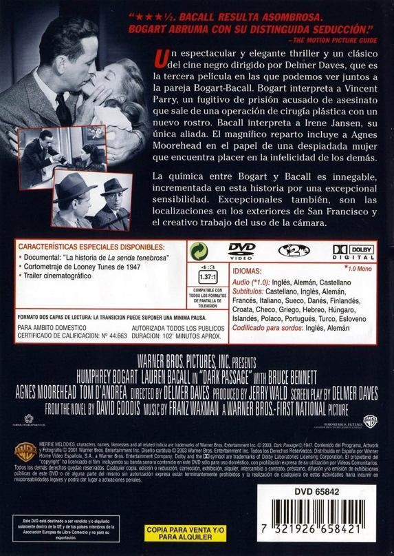 | Director(es): Delmer Daves | Reparto: Humphrey Bogart, Lauren Bacall, Bruce Bennett, Agnes Moorehead, Tom D’Andrea, Clifton Young, Douglas Kennedy, Rory Mallinson, Houseley Stevenson | Norma / Región: NTSC 4 | Cantidad de Discos: 1 | Lanzamiento: 2012 | Género(s): Drama | Audio: Inglés | SubtÃtulos: Español, Inglés, Portugués | TÃtulo: Dark Passage (1947)