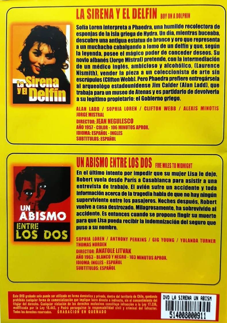 Cantidad de Discos: 2 | Lanzamiento: 2010 | Género(s): Aventura, Romance, Thriller. Drama | Audio: Español, Inglés | SubtÃtulos: Español | TÃtulo: Boy on a Dolphin (1957) / Le couteau dans la plaie (1962) | Director(es): Jean Negulesco / Anatole Litvak | Reparto: Alan Ladd, Clifton Webb, Sophia Loren, Alex Minotis, Jorge Mistral, Laurence Naismith, Piero Giagnoni, Gertrude Flynn /