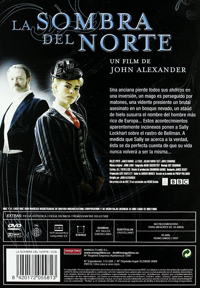 Cantidad de Discos: 2 | Lanzamiento: 2007 | Género(s): Thriller. Aventuras. Intriga. | Audio: Español, Inglés | Subtítulos: Español, Inglés | Título: The Shadow In The North | Director(es): John Alexander. | Reparto: Jared Harris, Dona Croll, David Harewood, Hayley Atwell, JJ Feild, Matt Smith, Billie Piper, John Standing, Antonia Pemberton, Owen Roe, Julian Rhind-Tutt, Richard Clews, Phil Cornwell. | Norma / Región: PAL (Región 2) | Cantidad de Discos: 2 | Lanzamiento: 2007 | Género(s): Thriller. Aventuras. Intriga. | Audio: Español, Inglés | Subtítulos: Español, Inglés | Título: The Shadow In The North | Director(es): John Alexander. | Reparto: Jared Harris, Dona Croll, David Harewood, Hayley Atwell, JJ Feild, Matt Smith, Billie Piper, John Standing, Antonia Pemberton, Owen Roe, Julian Rhind-Tutt, Richard Clews, Phil Cornwell. | Norma / Región: PAL (Región 2)