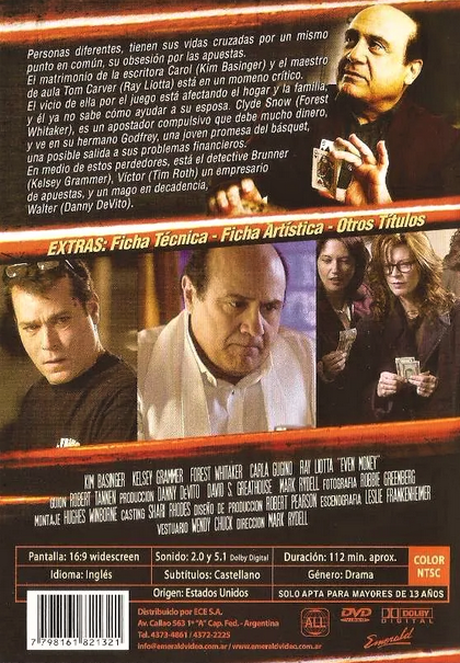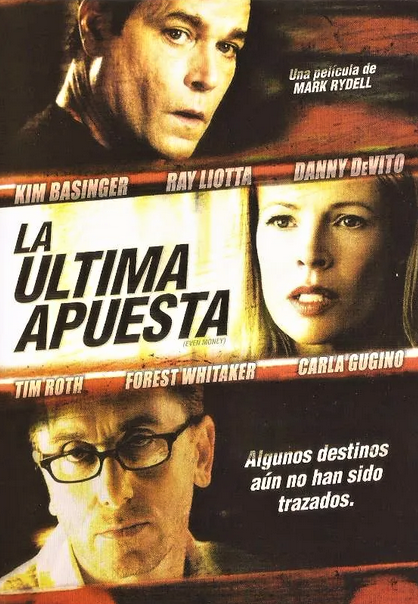 | Norma / Región: NTSC (Región 1, 4) | Cantidad de Discos: 1 | Lanzamiento: 2007 | Género(s): Drama | Audio: Inglés (Dolby Digital 5,1), Inglés (Dolby Digital 2,0) | SubtÃtulos: Español | TÃtulo: Even Money (La apuesta perfecta) | Director(es): Mark Rydell | Reparto: Kim Basinger, Danny DeVito, Kelsey Grammer, Nick Cannon, Ray Liotta, Forest Whitaker, Carla Gugino, Grant Sullivan, Jay Mohr, Cassandra