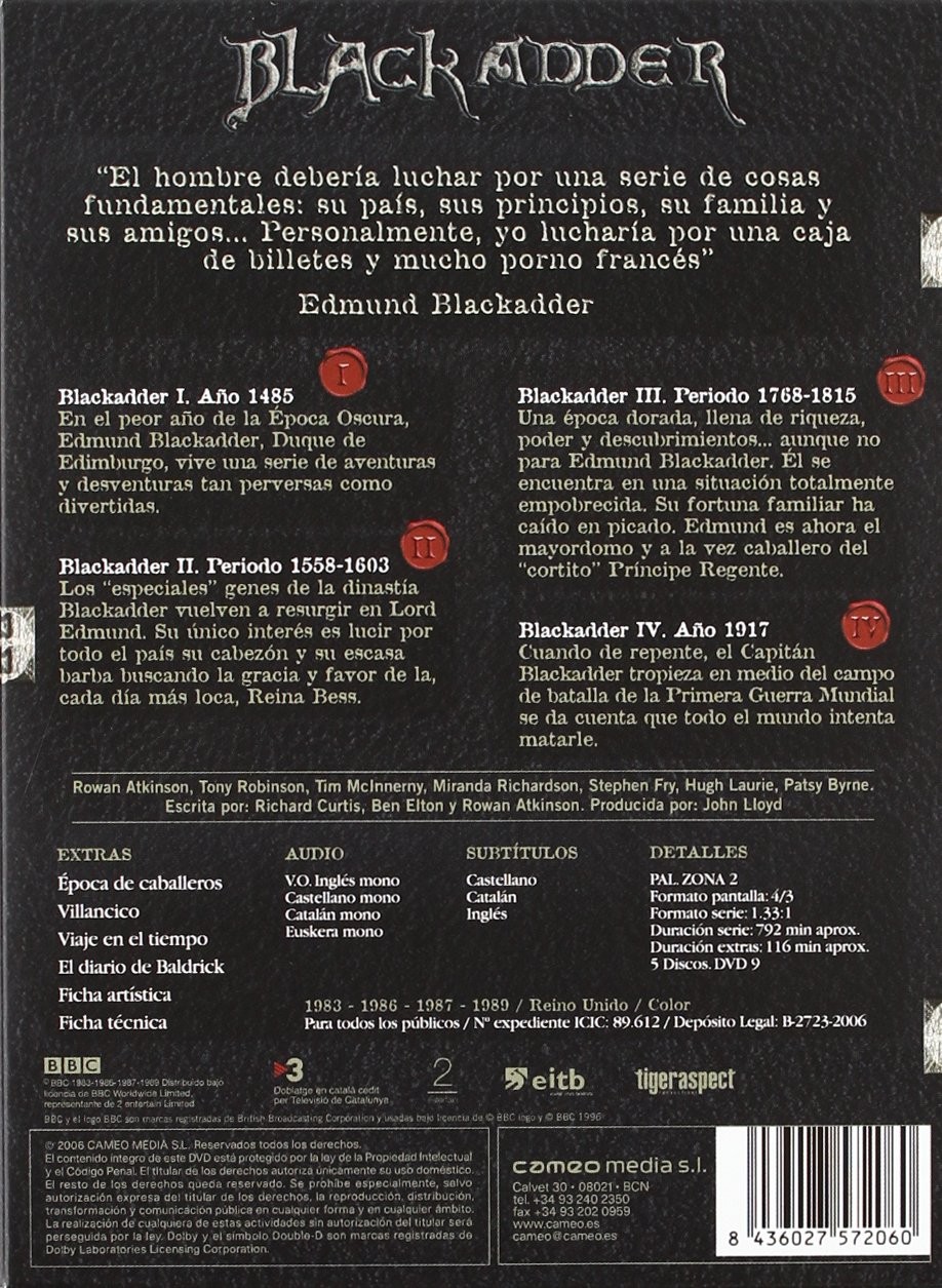 Cantidad de Discos: 5 | Lanzamiento: 1983 | Género(s): Serie de TV. Comedia. | Audio: Castellano, Inglés, Catalán | Subtítulos: Castellano, Inglés, Catalán | Título: The Black Adder | Director(es): Richard Curtis, Rowan Atkinson, Martin Shardlow, Geoff Posner. | Reparto: Rowan Atkinson, Stephen Frost, Tim McInnerny, Tony Robinson, Brian Blessed, Miranda Richardson, Elspet Gray, Hugh Laurie, Robert East, Helen Atkinson-Wood, Roy Evans, Bert Parnaby, Alex Norton, Natasha King, Peter Cook, Perry Benson. | Norma / Región: PAL (Región 2) | Cantidad de Discos: 5 | Lanzamiento: 1983 | Género(s): Serie de TV. Comedia. | Audio: Castellano, Inglés, Catalán | Subtítulos: Castellano, Inglés, Catalán | Título: The Black Adder | Director(es): Richard Curtis, Rowan Atkinson, Martin Shardlow, Geoff Posner. | Reparto: Rowan Atkinson, Stephen Frost, Tim McInnerny, Tony Robinson, Brian Blessed, Miranda Richardson, Elspet Gray, Hugh Laurie, Robert East, Helen Atkinson-Wood, Roy Evans, Bert Parnaby, Alex Norton, N