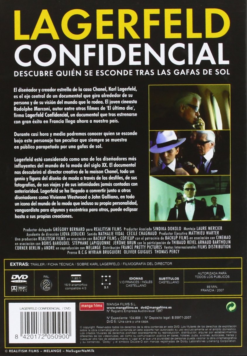 Cantidad de Discos: 1 | Lanzamiento: 2007 | Género(s): Documental | Audio: Inglés, Francés, Español | Subtítulos: Español, Inglés, Francés | Título: Lagerfeld Confidencial | Director(es): Rodolphe Marconi | Norma / Región: PAL (Región 2) | Cantidad de Discos: 1 | Lanzamiento: 2007 | Género(s): Documental | Audio: Inglés, Francés, Español | Subtítulos: Español, Inglés, Francés | Título: Lagerfeld Confidencial | Director(es): Rodolphe Marconi | Norma / Región: PAL (Región 2)