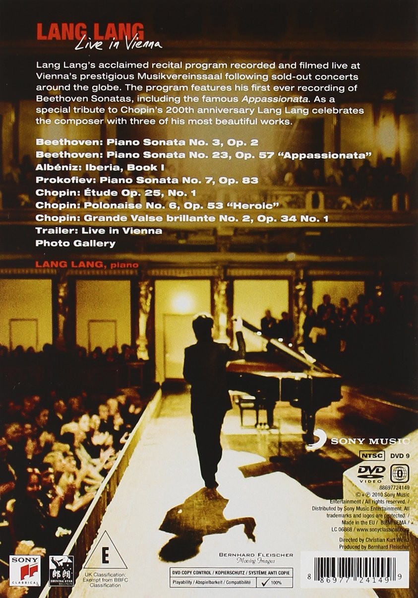 Filmado en vivo en la legendaria sala de conciertos Musikverein de Viena, este lanzamiento representa el segundo recital grabado en vivo de Lang Lang hasta la fecha después del éxito de ventas Live at Carnegie Hall en 2004, que marcó su avance internacional como artista discográfico. El programa de su debut en Sony presenta la primera grabación de Lang Lang de las sonatas de Beethoven: la famosa Appassionata, un hito en la literatura pianÃstica, se combina con la juvenil Sonata en do mayor op del compositor. 2, núm. 3. Un virtuosismo de otro orden se muestra en los recuerdos impresionistas de Albéniz de su España natal en el Libro 1 de Iberia. El programa se cierra con una de las explosivas Sonatas de guerra de Prokofiev, la revolucionaria Séptima Sonata. Finalmente, para celebrar el Bicentenario de Chopin, escuchamos tres bises de las obras más populares de este genio polaco: el Estudio para arpa eólica, la Polonesa heroica en la bemol mayor y el brillante Grande Valse Brillante No. 2. Presenta el recital completo filmado y una galerÃa de fotos extendida.