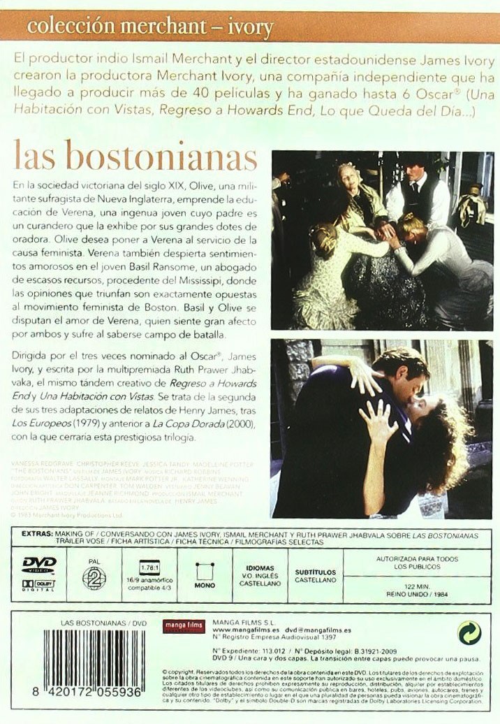 Cantidad de Discos: 1 | Lanzamiento: 1984 | Género(s): Drama. | Audio: Castellano, Inglés | SubtÃtulos: Castellano, Inglés | TÃtulo: The Bostonians | Director(es): James Ivory. | Reparto: Vanessa Redgrave, Christopher Reeve, Madeleine Potter, Jessica Tandy, Linda Hunt, Nancy Marchand, Wesley Addy, Nancy New, Jon Van Ness, Wallace Shawn. | Norma / Región: PAL (Región 2) | Cantidad de Discos: 1 | Lanzamiento: 1984 | Género(s): Drama. | Audio: Castellano, Inglés | SubtÃtulos: Castellano, Inglés | TÃtulo: The Bostonians | Director(es): James Ivory. | Reparto: Vanessa Redgrave, Christopher Reeve, Madeleine Potter, Jessica Tandy, Linda Hunt, Nancy Marchand, Wesley Addy, Nancy New, Jon Van Ness, Wallace Shawn. | Norma / Región: PAL (Región 2)