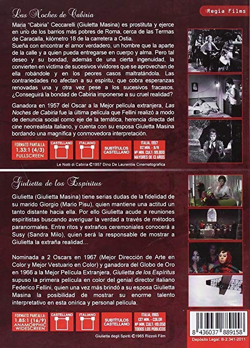 Cantidad de Discos: 2 | Lanzamiento: 2011 | Género(s): Drama | Audio: Español, Italiano | SubtÃtulos: Español | TÃtulo: Las Noches de Cabiria / Jiuliette de los Espiritus | Director(es): Federico Fellini | Reparto: Giulietta Masina, François Périer, Franca Marzi, Sandra Milo, Mario Pisu | Norma / Región: PAL (Región 2) | Cantidad de Discos: 2 | Lanzamiento: 2011 | Género(s): Drama | Audio: Español, Italiano | SubtÃtulos: Español | TÃtulo: Las Noches de Cabiria / Jiuliette de los Espiritus | Director(es): Federico Fellini | Reparto: Giulietta Masina, François Périer, Franca Marzi, Sandra Milo, Mario Pisu | Norma / Región: PAL (Región 2)
