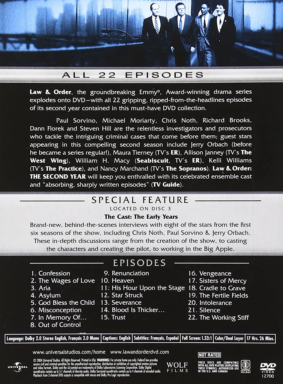 Cantidad de Discos: 3 | Lanzamiento: 1990 | Género(s): Serie de TV. Intriga. Drama. | Audio: Español, Inglés, Francés | SubtÃtulos: Español, Inglés, Francés | TÃtulo: La Ley y El Orden – Temporada 2 | Director(es): Dick Wolf, Constantine Makris, Jace Alexander, Edwin Sherin, Richard Dobbs, David Platt, Matthew Penn, Don Scardino, Martha Mitchell, Christopher Misiano, James Quinn, Jean de Segonzac, Arthur W. Forney. | Reparto: Jerry Orbach, Paul Sorvino, Dennis Farina, S. Epatha Merkerson, Benjamin Bratt, George Dzundza, Chris Noth, Jesse L. Martin, Dann Florek, Sam Waterston, Fred Dalton Thompson, Michael Moriarty, Dianne Wiest, Steven Hill, Elisabeth Röhm, Angie Harmon, John Fiore, Alana De La Garza, Leslie Hendrix, Andrea Navedo, Jill Hennessy, Carolyn McCormick, J.K. Simmons, Milena Govich, Jeremy Sisto, Annie Parisse, Anthony Anderson, Richard Brooks, Linus Roache, Carey Lowell, David Lipman, John Cariani, Stephen Henderson. | Norma / Región: NTSC (Región A) | Cantidad de Discos: 3 | Lanzamien