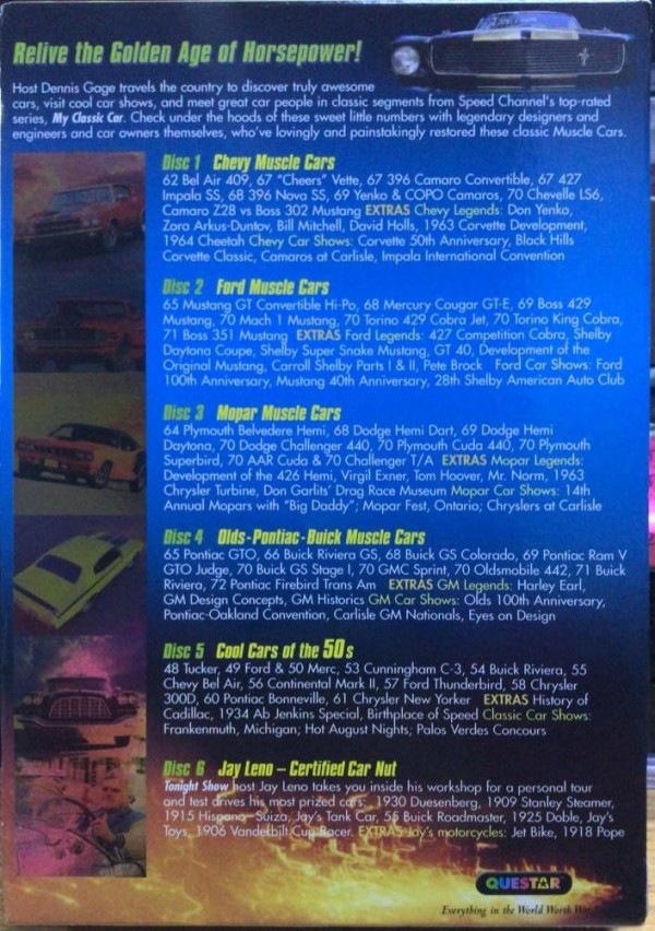 Recupera los dÃas dorados de la era de los caballos de fuerza con este conjunto completo de seis volúmenes, ahora disponible en un empaque más elegante y con más estilo que ahorra espacio. Desde la década de 1950 hasta principios de la de 1970, nada satisfizo más el amor de los estadounidenses por la velocidad, el estilo y la diversión de quemar neumáticos que los Big Block V-8 Muscle Cars. El presentador Dennis Gage viaja por el paÃs para descubrir autos realmente asombrosos, visitar exhibiciones de autos geniales y conocer gente excelente en segmentos originales de la serie mejor calificada de Speed ​​Channel, My Classic Car. Se presentan más de 70 muscle cars atractivos (¡y muy geniales!). Los volúmenes incluyen: Chevy Muscle Cars, Mopar Muscle Cars, Cool Cars of the 50s, Ford Muscle Cars, Oldsmobile-Pontiac-Buick Muscle Cars y Jay Leno-Certified Car Nut, un recorrido por la colección personal del presentador de The Tonight Show.