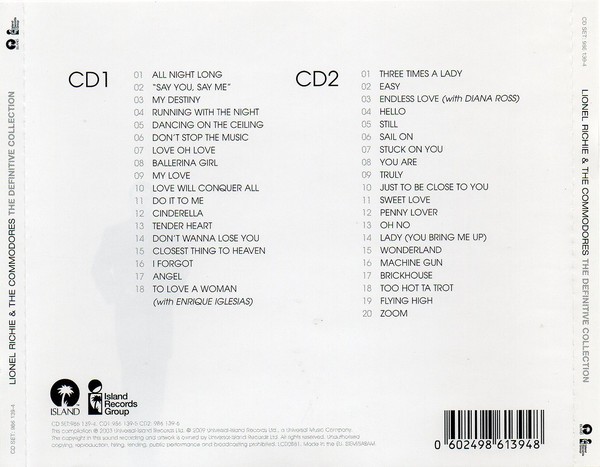 Artista(s) / Grupo: Lionel Richie & The Commodores | Cantidad de Discos: 2 | Lanzamiento: 2009 | Género(s): Electronic, Rock, Funk / Soul, Pop | Estilo(s): Soft Rock, Rhythm & Blues, Soul, Disco | TÃtulo: The Definitive Collection | Artista(s) / Grupo: Lionel Richie & The Commodores | Cantidad de Discos: 2 | Lanzamiento: 2009 | Género(s): Electronic, Rock, Funk / Soul, Pop | Estilo(s): Soft Rock, Rhythm & Blues, Soul, Disco | TÃtulo: The Definitive Collection