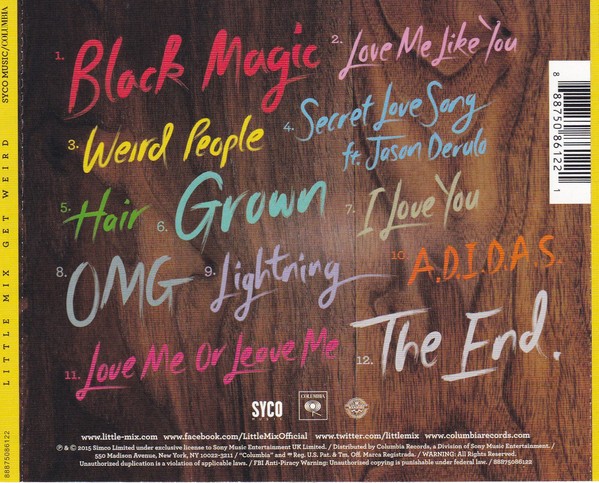 Artista(s) / Grupo: Little Mix | Cantidad de Discos: 1 | Lanzamiento: 2015 | Género(s): Electronic, Rock, Funk / Soul, Pop | Estilo(s): Synth-pop, Contemporary R&B | Título: Get Weird | Artista(s) / Grupo: Little Mix | Cantidad de Discos: 1 | Lanzamiento: 2015 | Género(s): Electronic, Rock, Funk / Soul, Pop | Estilo(s): Synth-pop, Contemporary R&B | Título: Get Weird