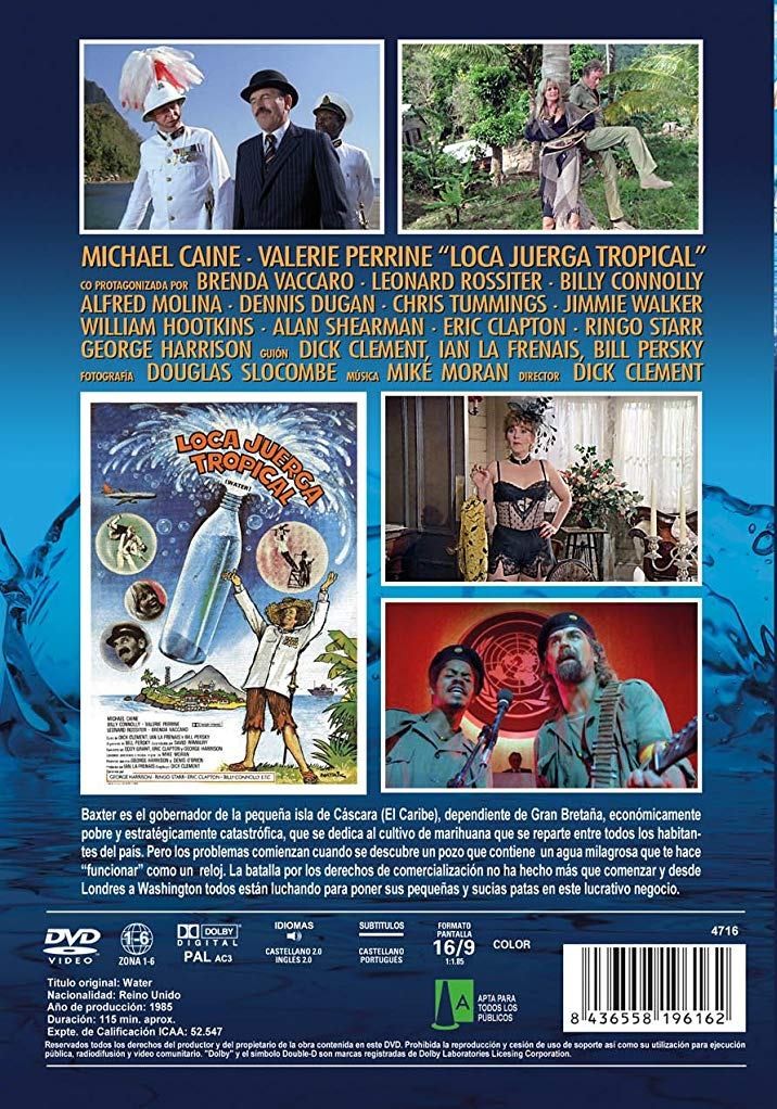 Cantidad de Discos: 1 | Lanzamiento: 2018 | Género(s): Aventuras. Comedia. Drama | Audio: Español (Dolby Digital 2.0), Inglés (Dolby Digital 2.0) | SubtÃtulos: Español, Portugués | TÃtulo: Water (1985) | Director(es): Dick Clement | Reparto: Michael Caine, Valerie Perrine, Brenda Vaccaro, Leonard Rossiter, Billy Connolly, Alfred Molina, Dennis Dugan, Chris Tummings, Jimmie Walker, William Hootkins, Alan Shearman, Eric Clapton, George Harrison, Ringo Starr | Norma / Región: PAL (Región 2) | Cantidad de Discos: 1 | Lanzamiento: 2018 | Género(s): Aventuras. Comedia. Drama | Audio: Español (Dolby Digital 2.0), Inglés (Dolby Digital 2.0) | SubtÃtulos: Español, Portugués | TÃtulo: Water (1985) | Director(es): Dick Clement | Reparto: Michael Caine, Valerie Perrine, Brenda Vaccaro, Leonard Rossiter, Billy Connolly, Alfred Molina, Dennis Dugan, Chris Tummings, Jimmie Walker, William Hootkins, Alan Shearman, Eric Clapton, George Harrison, Ringo Starr | Norma / Región: PAL (Región 2)