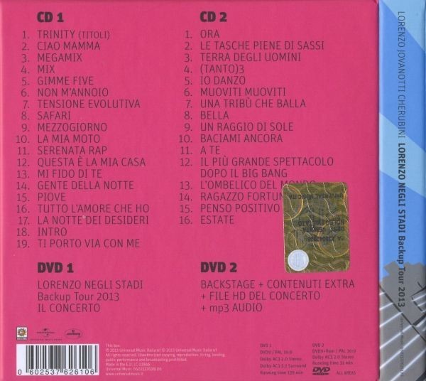 | DVD1-1 | Jovanotti– | Lorenzo Negli Stadi Backup Tour 2013 – Il Concerto | 2:19:00 |