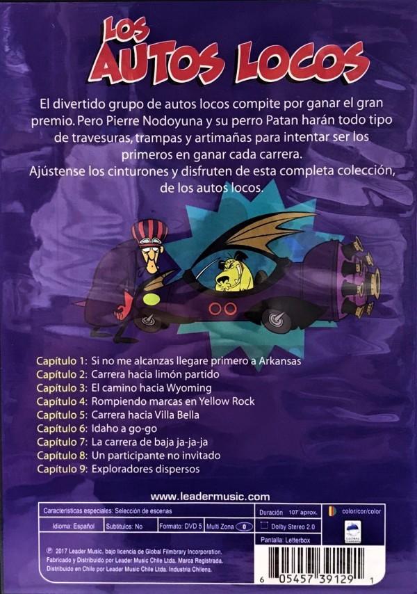 Serie de TV (1968-1969). 17 episodios (cada uno de los cuales incluÃa dos carreras distintas, haciendo un total de 34 carreras). «Los autos locos» es una serie de dibujos animados de la productora estadounidense Hanna-Barbera sobre un grupo de once coches de carrera que compiten entre sà en diferentes rallies, con sus pilotos intentando ganar el tÃtulo de «Piloto Más Loco del Mundo». La serie era inusual por el gran número de personajes habituales, veintitrés en total, entre los que se incluia el villano Pierre Nodoyuna y su perro, Patán.